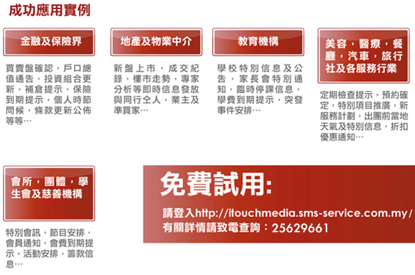 每年內地自由行來港數量超過二千三百萬人,到港旅客集中購買美容、品牌、電子、珠寶、嬰兒用品等, 內地市場具有龐大潛力, 手機短訊可以針對目標客戶發放短訊廣告, 達到低成本, 高效益和一擊即中的宣傳效果。
