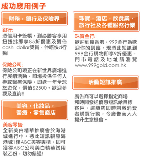 根據2009年12月香港電訊管理局的數據, 現在全港超過1200萬手機用戶, 當中每人每年平均接收超過60個短訊。透過龐大電訊網絡的客戶資料庫, 廣告商可以針對目標客戶發放短訊廣告, 達到低成本, 高效益和一擊即中的宣傳效果。